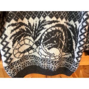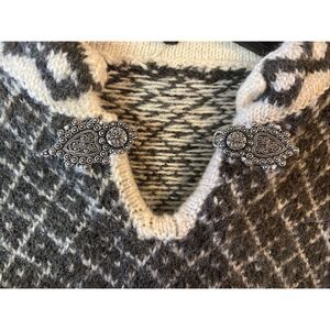 Women’s Wool Scandinavian Pullover Sweater. Has a peasant neckline with clasp. Gray and cream pattern. No size or fabric tag. Size was taken from pit to pit measurement and assigned typical women’s sizing. Size Large (5422)Measurements: Pit to Pit 20” Length 26”