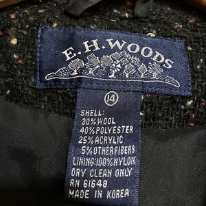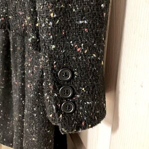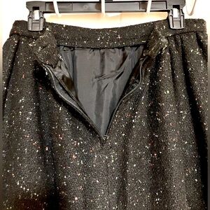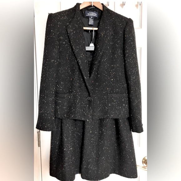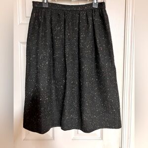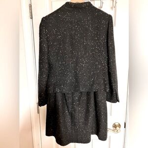 Black suit with speckles of color in the fabric. Has texture. Featuring two lower front pockets on jacket. Both skirt and jacket are lined. Great condition. From non-smoking home.
