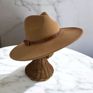 Wool Tan Fedora, Western, Fall, Winter Hat with Brown leather belt band.
