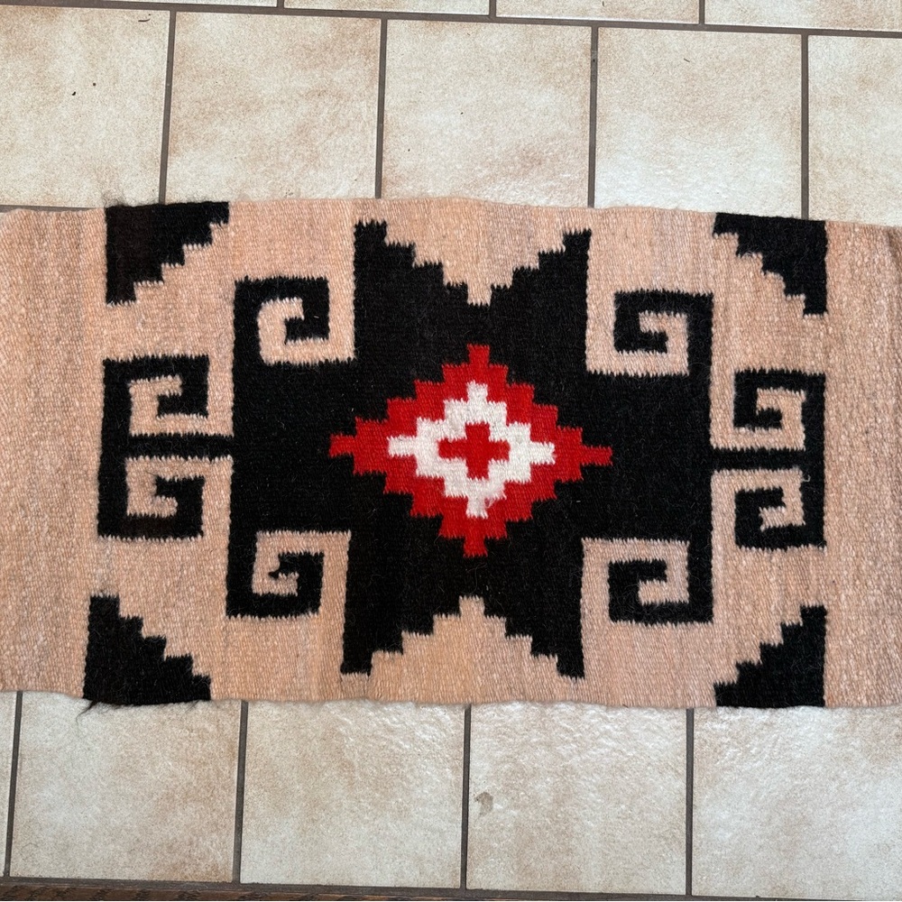 Enhance your home with this stylish geometric patterned rug. Featuring bold black, vibrant red, and warm tan colors, this rug adds a touch of elegance to any room. Perfect for creating a cozy and inviting atmosphere.