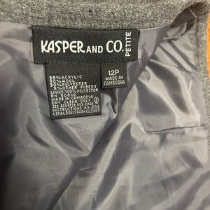 Kasper & Co. wool blend fringed gray vintage skirt with pink stitching, size 12P, 29" long including tassels and 16" across at waist.