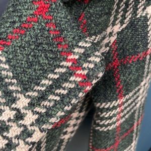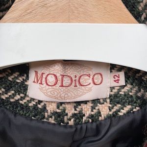 60% wool, 40% viscose coat. Worn once. Excellent condition. I am size S. Will also fit size M. European size 42. Length is a bit lower than knee. Very stylish. Green with red color.