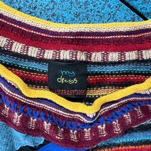 Wool dress patchwork with see through mesh inserts size M. bought in Cannes, France, in the beginning of the 2000s. vintage wool dress in fair condition. very original and easy to wear. Black mesh inserts around the patchwork of materials gives originality, allure and sexiness to this great mid season dress!