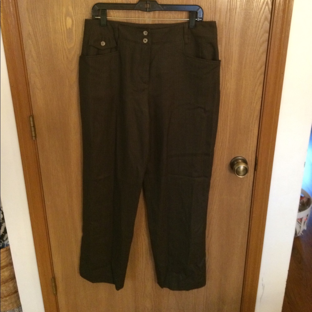 Nice wool dress pants. Herringbone design in brown. Pockets on front and back. Double button and zipper closure on front. Fully lined. 100% wool