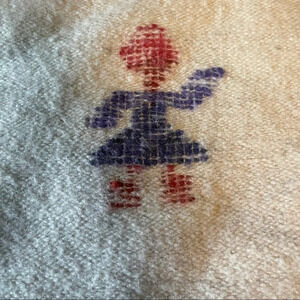 This is a vintage big wool rug woven with purple and red stripes and a big grey stripe in the middle. There is a pattern of people on the rug and is in great vintage condition with a couple of small nickel to quarter sized coffee stains and one small hole in the middle. (Easily repaired). I think it is Guatemalan. It is really gorgeous
