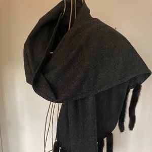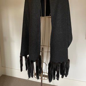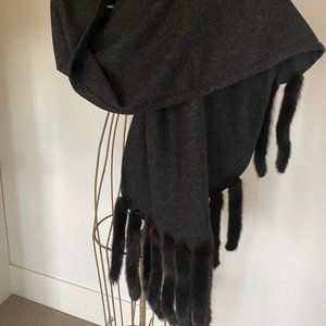 Hand sewn, one of a kind shawl with black mink tails. From the 1980's. Charcoal grey wool flannel. Measures 21" wide, 72" long, and fringe is 8" long. Excellent condition.