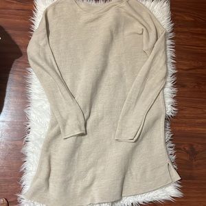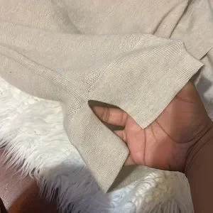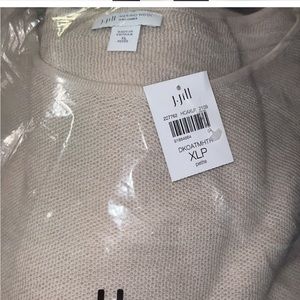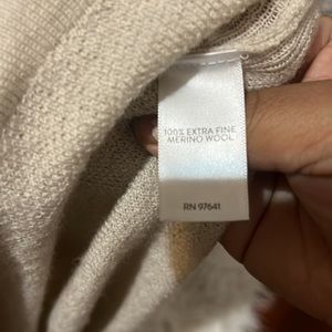 Sweater is tan oversized sweater that is 100% extra fine merino wool. Does not have a brand name tag or size but from research its j jill and i would say its an XL.please let me know if you have questions.