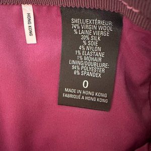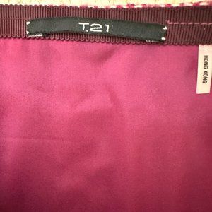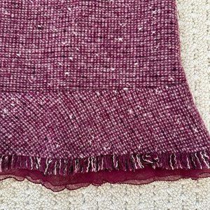 Wool tweed midi skirt with silk chiffon trim at bottom. A-line shape. Side zip close. Fully lined. Main color: wine. Approx. measurements in inches: waist 24, length 25. In new condition.