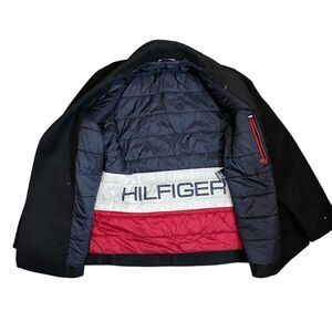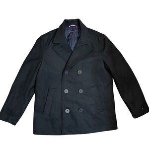 Wool Blend Tommy Hilfiger Double Breasted Peacoat in great condition with no flaws. Perfect for cooler weather with it's insulated lining. It has two exterior hand pockets and one interior zipper pocket. The exterior fabric color is black. Size L.