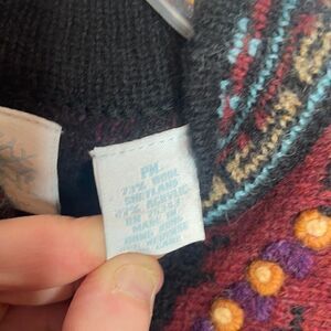 Wool Blend Beautiful Designed Cardigan. Size Petite Medium. Design on front and sleeves. Colors: purple and black with tan, maroon and blue designs. 73% wool 27% acrylic. I don’t know the brand it just says petite. Excellent condition.