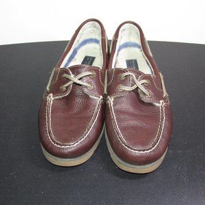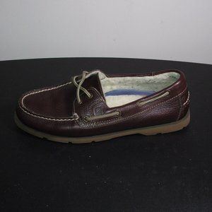 Brown leather boat shows from Sperry. Features a wool lining and a gum rubber outsole with the classic wave-siphoning design. Size 9