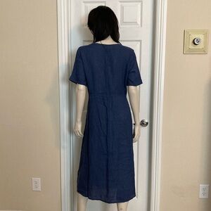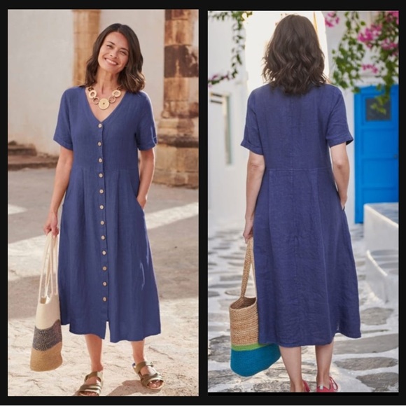 Our new button-through dress is made from 100% linen with functional pockets, perfect for relaxing.