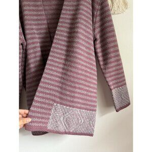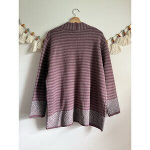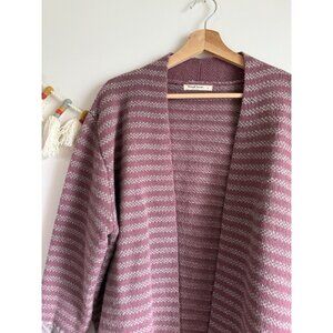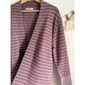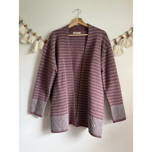 WoolOvers Lambswool Striped Open Front Mauve Gray Cardigan Cottage Cozy Winter L