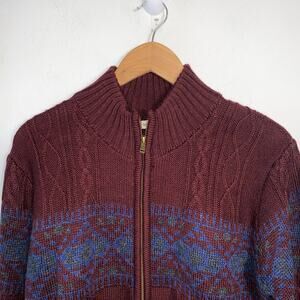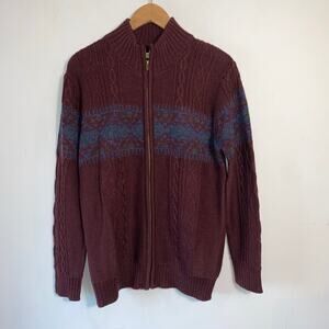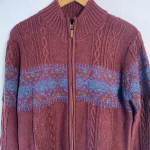 WoolOvers Mens 100% Wool Zip Cardigan Sweater M Burgundy Nordic Cable Knit