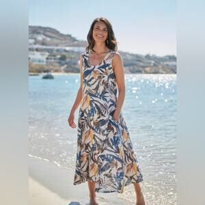WoolOvers pocket pinafore Tropical Leaves Print Relaxed Long Linen Dress 14 new