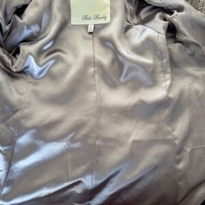 Black, grey, and white tweed wool A-line jacket with silver metallic threads. 3 buttons in light pink/red translucent plastic. Sleeve length hits just below elbow. Faux fur collar is removable. Size 6. Gently worn.