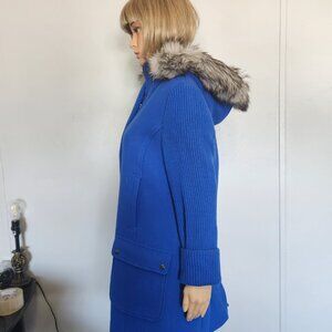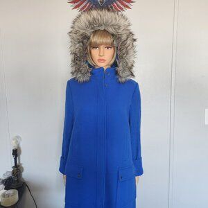 NWT Talbots Royal blue woo/nylon blend coat, faux fur trimmed detachable hood, zipper and snap closures, 2 snap closure pockets, 2 regular pockets, tags states $329.00. mEasurements are arm pit to pit, 23", shoulders 18", sleeves 23" and length 33".