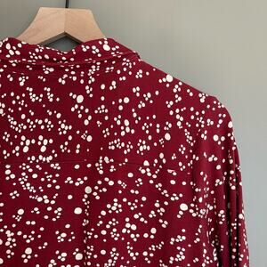 Woolovers Irregular Spot Red Jersey Print 3/4 Sleeve Shirt, Size Medium, Deep Red with White Polka Dot Spot Print, Button Front, Collar, Stretch Jersey, In like new condition with no flaws or signs of wear.