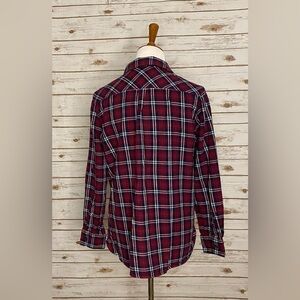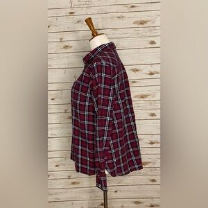 Cranberry, navy blue and white plaid/check pattern; collared; long sleeves w/ single-button cuffs; 7-button placket; two chest pockets