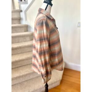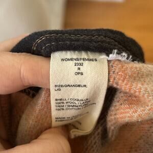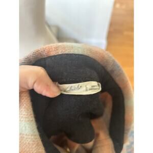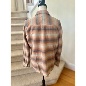 Excellent condition. Shacket style--long sleeve shirt jacket. Button down, collared, pocket at chest. Thick wool in an aqua blue and orange tan ombre stripe.