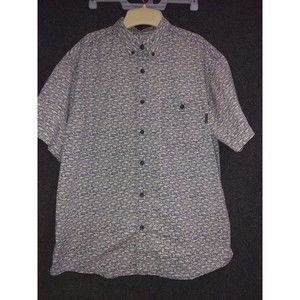 Woolrich Blue Hawaiian Palm Mini jeep Pattern Button Down Shirt SS Mens Size L. Pit to pit 25 Length 29
