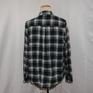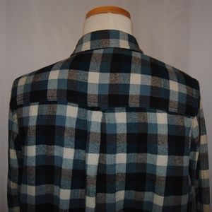 Large gently used Woolrich flannel shirt. Blue and black stripes. No rips or tears. No holes. Great looking shirt. Just in time for cool weather.