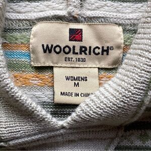 Woolrich British Tan Hooded Wool Blend Sweater Size Medium. Excellent used condition. Tan with teal, orange and green stripe design. Measures chest 38”, length 22”, sleeve 22.5”.