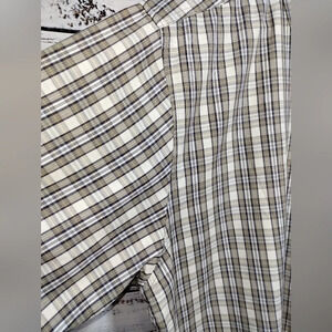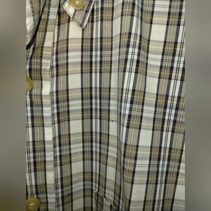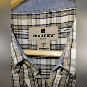This stylish Woolrich Button Down Shirt in a refreshing green and cream plaid pattern is perfect for a casual and lightweight summer look. It's a size Large, measuring 25" from armpit to armpit and 32 inches in length. Despite being in good used condition, there is one minor hole near the pocket.