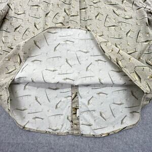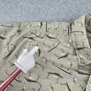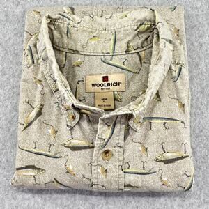 Woolrich Camp Shirt Mens XL Short Sleeve Tan Fishing Lures All Over Print Button Down Stretch