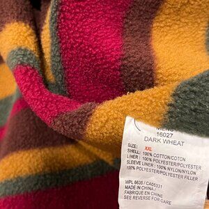 This canvas jacket features a leather collar, button front, hand pockets, patch flap pockets with side pockets, and an inside pocket. The body of jacket is lined in a striped fleece, the sleeves are lined with satin quilt fabric. Woolrich name is on the buttons, embroidered on sleeve cuffs, and embossed in the inside lining. Excellent condition, no stains or holes. Washable, color is call "dark wheat', the inside fleece lining is multi-colored. Size XXL
