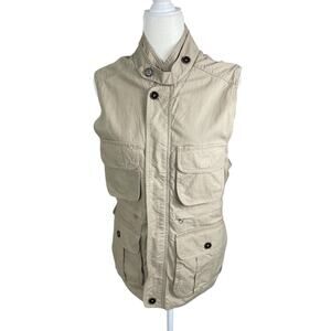 100% cotton fishing vest with several pockets to outside and inside. Mock neck with button closure, full zip front with a top and bottom button closure. Elastic back with adjustable sides. Tan. Size XS. Please see photos for measurements.