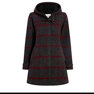 Woolrich Women's Plaid Fall Hooded Wool Coat. Mid length. Ember Peak style. Red and gray checkered pattern. Pockets. Hidden zipper. Very thick pea coat. Perfect for fall, winter, snow days, harvest, pumpkin patch and casual wear. No flaws.