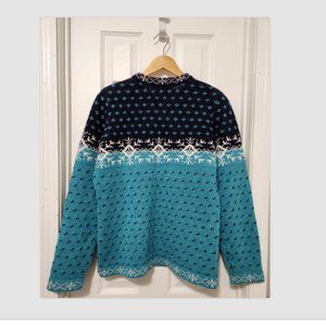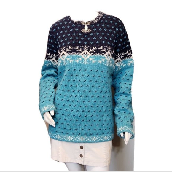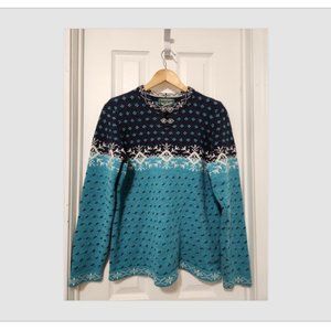 Woolrich Woolen Mills Fair Isle Marine Multi Blue and ivory Lambs Wool Nylon blend Pullover Sweater with 2 metal Heart Closure Clasps at neckline. Women's Size Petite Large. Beautiful sweater. Pre owned by a large busted petite woman. Ivory snowflakes on sweater and at collar trim and cuff edges trim. Logo embroidered at bottom near hem on one side on front of sweater.