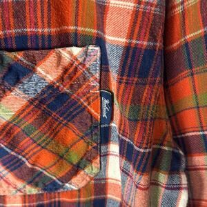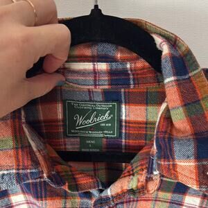 Gently Used Woolrich Button Down Flannel Shirt. This is a men's large. White, blue, and orange classic flannel plaid pattern throughout. Front pocket. Woolrich tag on the pocket.