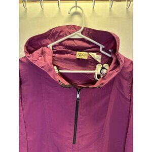 Size Large, gently used, smoke free, pet friendly home, very clean, no stains or holes, measurements in photos. All zippers work, has attached hood. Light weight material.