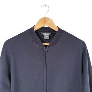 Features: mockneck with ribbed trim, long sleeves, full zipper front closure, pockets, short length, cotton blend material with stretch. Color: black.