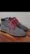 Stylish gray wool ankle boots featuring vibrant red laces. Vibram soles with hiking style treads. Classic, retro styling.