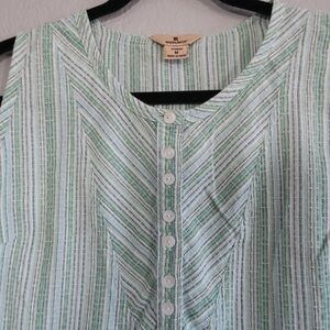 Lightweight sleeveless striped green top by Woolrich, 100% cotton, buttoned detailing. Preloved condition, small dark stains on the front. Please see all pictures.