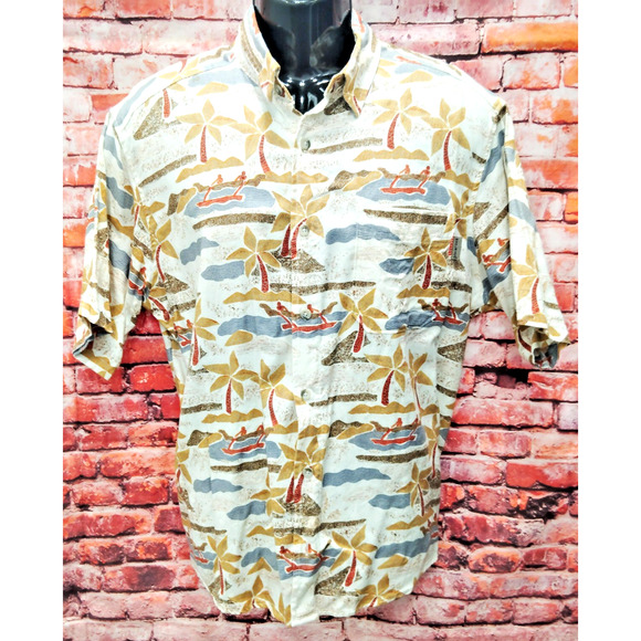 Woolrich Hawaiian Shirt Mens M Beige Palm Beach Print Short Sleeve Button Down