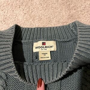 Woolrich charcoal grey cable knit 100% cotton sweater size XS. Tag says charcoal but it looks like it’s slightly olive green/ grey to me personally. Very heavy sweater, perfect for fall/ winter and has zero noticeable flaws🩶 Could also fit size small- I am a true small and it fits me great.