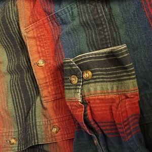 Casual button-down with bold red and blue stripes. Ideal for relaxed settings. Heavy weight flannel. Blanket Pattern. Warm. The colors are darker than pictured.
