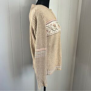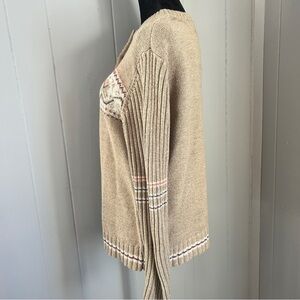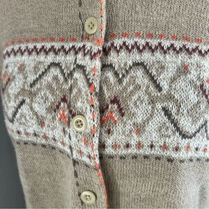 Keywords: Woolrich sweater, Fair Isle cardigan, women’s size large, button-front sweater, neutral winter sweater, Cottagecore