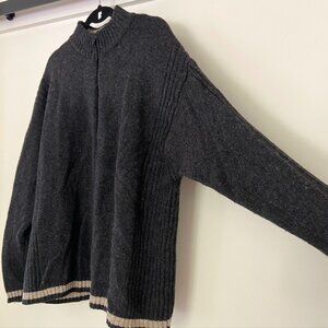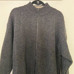 Wrap up in the warmth of this Woolrich lambswool blend full zip charcoal gray sweater with a beige stripe along the hem.