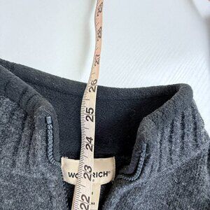 Cozy, classic Woolrich ¼-zip sweater in onyx heather gray with a red & white Fair Isle/Nordic band across the chest and sleeves. Soft lambswool-rich knit, mock neck, and ribbed cuffs/hem—perfect for après-ski, winter weekends, and holiday photos.