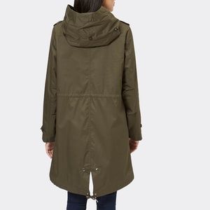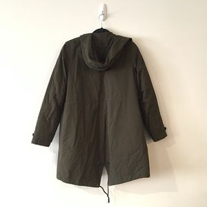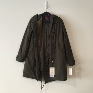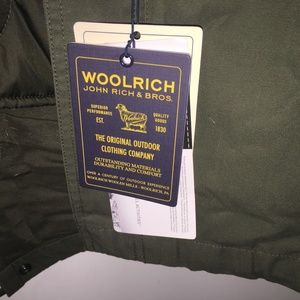 Woolrich Women's Zip-Front Winter Coat with hood also has button and snap closures. This parka has real rabbit fur trimming on the inside (removable). Color is described as Military Olive. 2 front pockets. Never worn, original tags attached. Polyester shell, lining, and insulation.