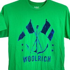 Woolrich men's short sleeve graphic T-shirt. It is a bright Kelley green with a blue anchor and flags. Woolrich on the front. 100% cotton. Size medium new with tags. Laying flat it measures approximately 21 inches armpit to armpit and the length from the top of the shoulder down the back is 27 inches.
