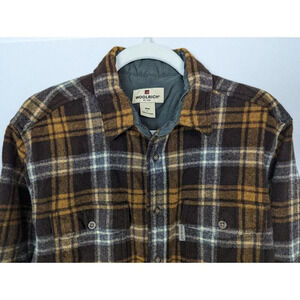 Woolrich Mens L 100% Wool Button Up Shirt Brown Darkwood Plaid Flannel Pockets