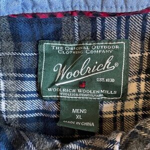 Casual button-down with a navy and white plaid pattern. Ideal for everyday wear and for fall layering, great pre loved condition size XL woolrich flannel