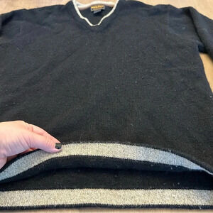 Woolrich Men’s Wool Blend V-Neck Sweater Size M Black with Tan contrast around inside hem, cuff, and neck