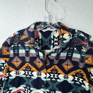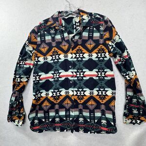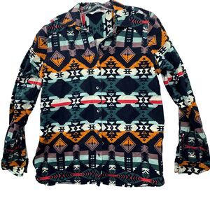 Vibrant button down shirt with geometric patterns. Features a mix of colors for a bold look. Perfect for casual wear.